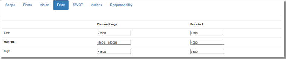 Document Your Company Volume ranges (in the chosen unit of volume) and Prices (in the chosen curency)