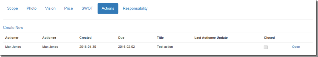 Once created, actions are displayed under the Action tab of the Strategic Planner. Collectively, actions organize the strategic roadmap of the Strategic Planner.