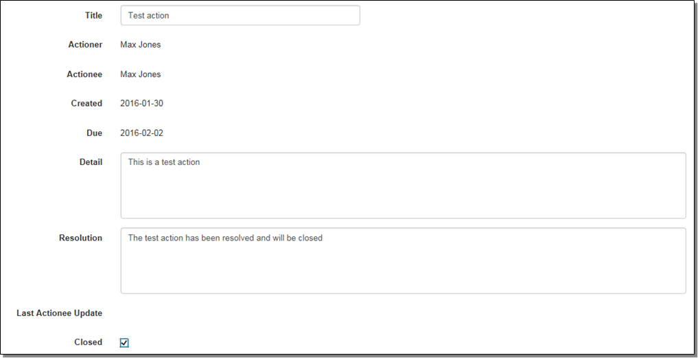 The Actionee receiving the action can enter resolution comments and click on close when the action is completed.