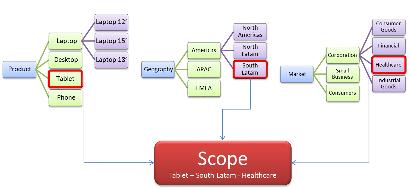 Strategic dimension: dimension defines the scope of the Strategic Planner (see Scope), in this example above, market and product.